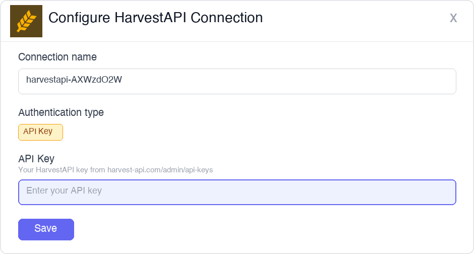 Register your HarvestAPI key with Scalekit so it can authenticate LinkedIn data requests on your behalf. You’ll need an API key from your HarvestAPI dashboard.